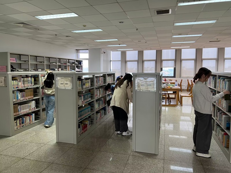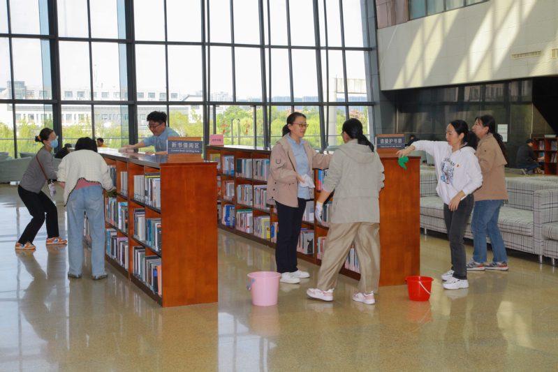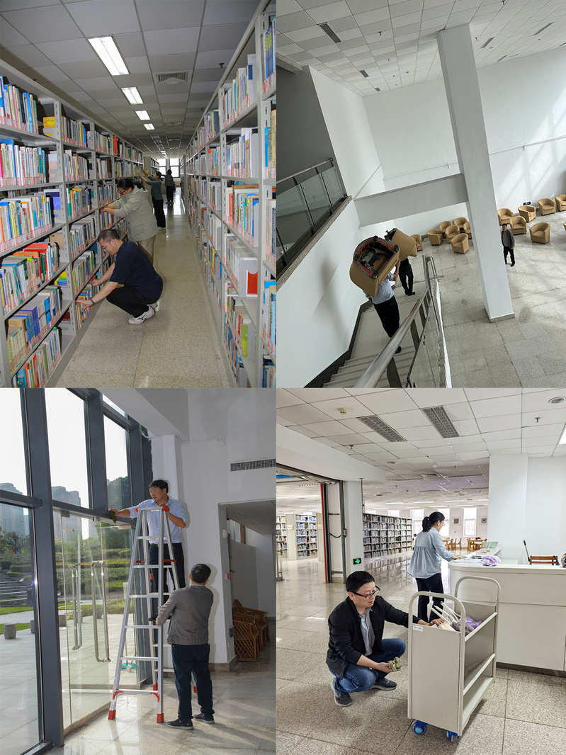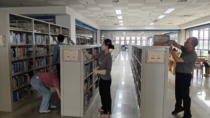 活动现场,大家分工明确,干劲十足。根据预先安排,两个党支部有序地分成两个工作小组,每个小组的成员都积极主动地承担起各自的任务。工作内容包括两个方面:一是对全馆各个角落进行清洁、整理;二是清理馆内空间,擦拭整理好的书架和书桌。负责清洁的同志手持抹布、扫帚,不放过场馆的每一个角落;他们蹲下身子,仔细擦拭书架的缝隙、边缘和背面,灰尘在他们的努力下消失得无影无踪。负责整理书籍的同志穿梭在书架之间,按照分类规则,将原本有些杂乱的书籍一一归位,摆放得整整齐齐。经过大家长达两小时的齐心协力,阅览空间布局变得更加合理有序,书籍按照分类重新摆放,不仅为读者创造了更加宽敞舒适的阅读空间,还使得各类书籍的取阅更加便捷,让读者在使用、阅览时更加轻松。同时大家还对消防设施、书架螺丝和木板是否松动进行了仔细检查,熟悉岗位周边环境和设备,熟知疏散通道及疏散要求,确保场馆安全。