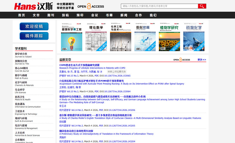 Hans汉斯中文开源学术交流平台涵盖了自然科学、工程技术、医药卫生、农业科学、哲学与人文科学等多个学科领域的中文学术资源。平台收录了大量的中文期刊论文、会议论文、学位论文等,为用户研究和学习提供了丰富的资料。此外,平台还提供了一些外文学术资源,以满足不同用户的需求。