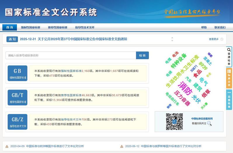 该系统收录了中国国家标准(GB)、行业标准、地方标准以及团体标准等各类标准文件,覆盖了工业、农业、服务业等多个领域,包括强制性标准和推荐性标准。用户可以在线浏览、下载和打印标准全文,也可以通过关键词、标准编号等方式进行检索。