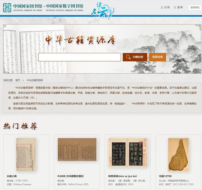 “中华古籍资源库”是由国家图书馆(国家古籍保护中心)主持建设的全国性古籍特藏数字资源统一发布与共享平台。该库是国家级文化工程“中华古籍保护计划”的核心成果,体现了“再造善本”与“数字化回归”的重大战略意义。平台秉持“公益、开放、共享”的理念,致力于将深藏于禁城的珍稀文献转化为面向全球开放的文化资产,是目前国内藏量最大、最具权威性的古籍影像库之一。